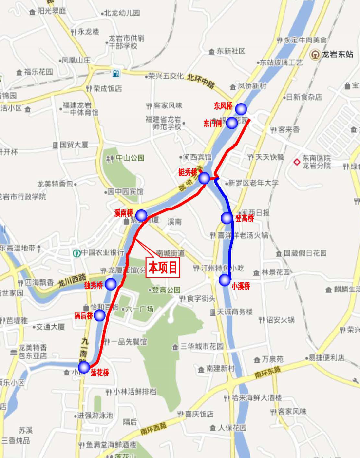 其中,沿線除東風(fēng)橋、溪南橋和登高橋處采用下穿橋梁方式,其余交叉均采用平交設(shè)置斑馬線過街,工程內(nèi)容包括綠道、蘇溪河景觀平臺(tái)、隔后泉景觀節(jié)點(diǎn)、休憩設(shè)施、沿線綠化的改造提升、周邊機(jī)動(dòng)車道的改造、沿線擋墻、圍墻、截污溝和截污井的美化提升及沿線雕塑。