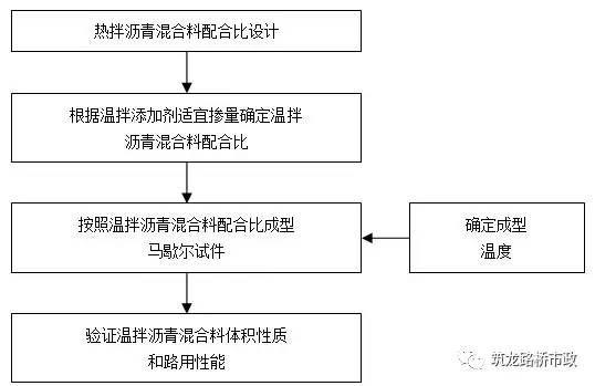 溫拌瀝青混合料的生產(chǎn)配合比設(shè)計(jì)與熱拌瀝青混合料的設(shè)計(jì)方法基本一致,只是溫拌瀝青混合料室內(nèi)成型溫度不同(比熱拌瀝青混合料低20-25℃),溫拌瀝青混合料配合比設(shè)計(jì)過程見下圖。溫拌添加劑摻量很小,故理論密度計(jì)算時(shí)可不考慮其影響。