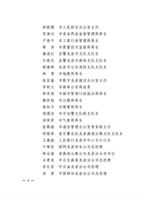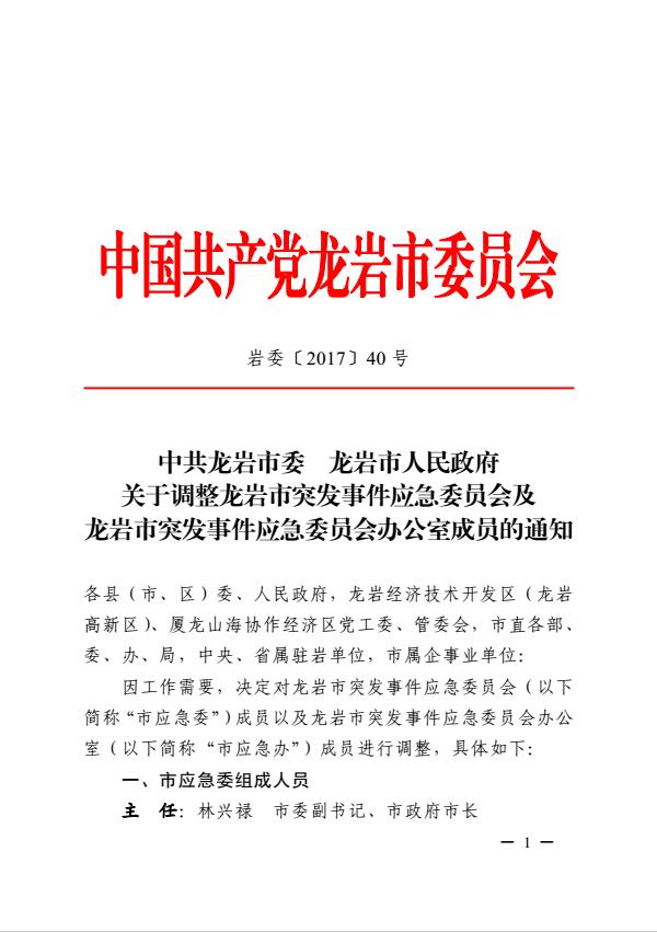 市委關于調整龍巖市突發(fā)事件應急委員會及龍巖市突發(fā)事件應急委員會辦公室成員的通知(巖委【2017】40號)