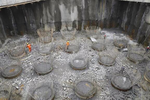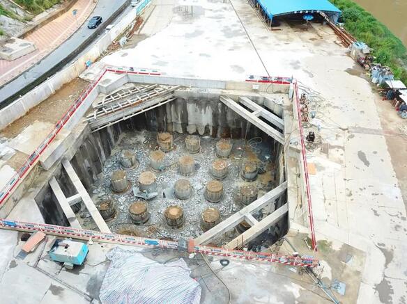 8月24日,繼龍巖大道高架橋主橋主塔樁基、承臺基坑開挖完成后,項目已進(jìn)入主塔承臺施工階段主橋封底混凝土澆筑完成0.75米(共1.5米),主橋轉(zhuǎn)體關(guān)鍵設(shè)備鑄鋼球鉸已生產(chǎn)完成現(xiàn)場正進(jìn)行樁頭破除作業(yè)。由于連續(xù)橫跨贛龍鐵路、龍廈鐵路、羅龍東路、龍津河、雙洋路,主橋采用不對稱跨塔梁同時轉(zhuǎn)體施工,其轉(zhuǎn)體總重達(dá)2.366萬噸,轉(zhuǎn)體懸臂173.75m,施工難度巨大。為避免對城市道路及鐵路運行的影響,主橋?qū)⒉捎貌粚ΨQ跨塔梁施工并分二次轉(zhuǎn)體,下一步進(jìn)行控制性工程為兩次主塔轉(zhuǎn)體施工。